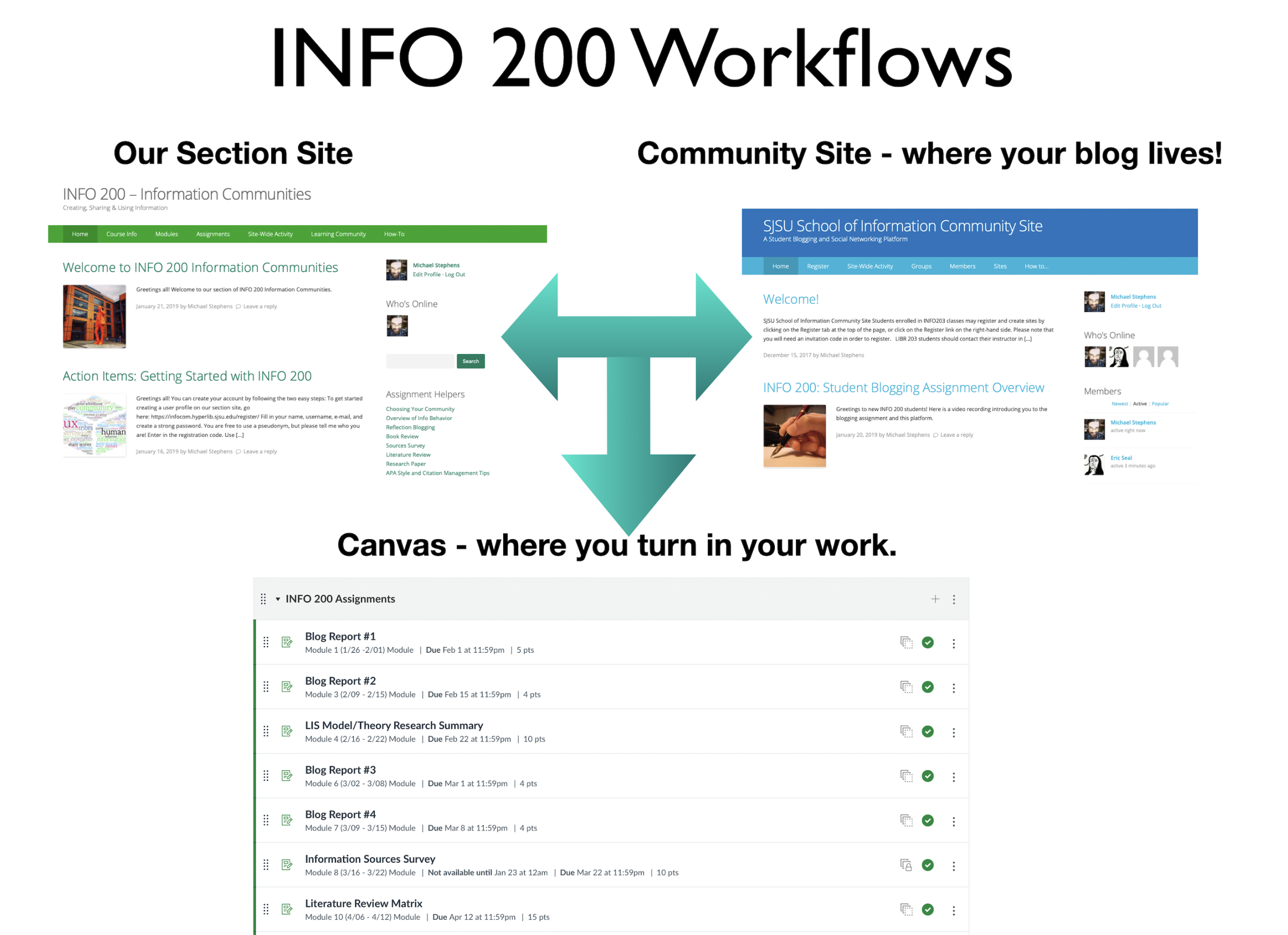 This site – https://infocom.hyperlib.sjsu.edu/ – is the central hub for our section’s learning community. All news, announcements and course requirements specific to our section will be communicated here. Canvas is used for grading purposes only. This allows you to gain valuable experience participating in an open online community space you may one day use in your professional positions. This site allows online interaction via news feeds, status updates, and student profiles. NOTE: You can give as much or as little information as you’d like in the profiles section. If you choose to use an screename/alias, please let me know so I can track your grading and assignments. You will also be using your blog created for INFO 203 for reflection blogging at our companion site: https://ischoolblogs.sjsu.edu/info/ Both this site and the Community Site run on WordPress and Buddypress. The graphic below illustrates the three “places” we will interact: our section site (here), the Community Site, and Canvas.